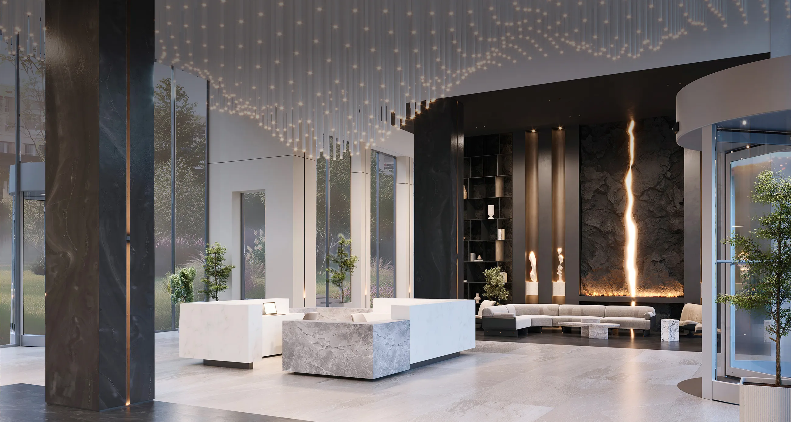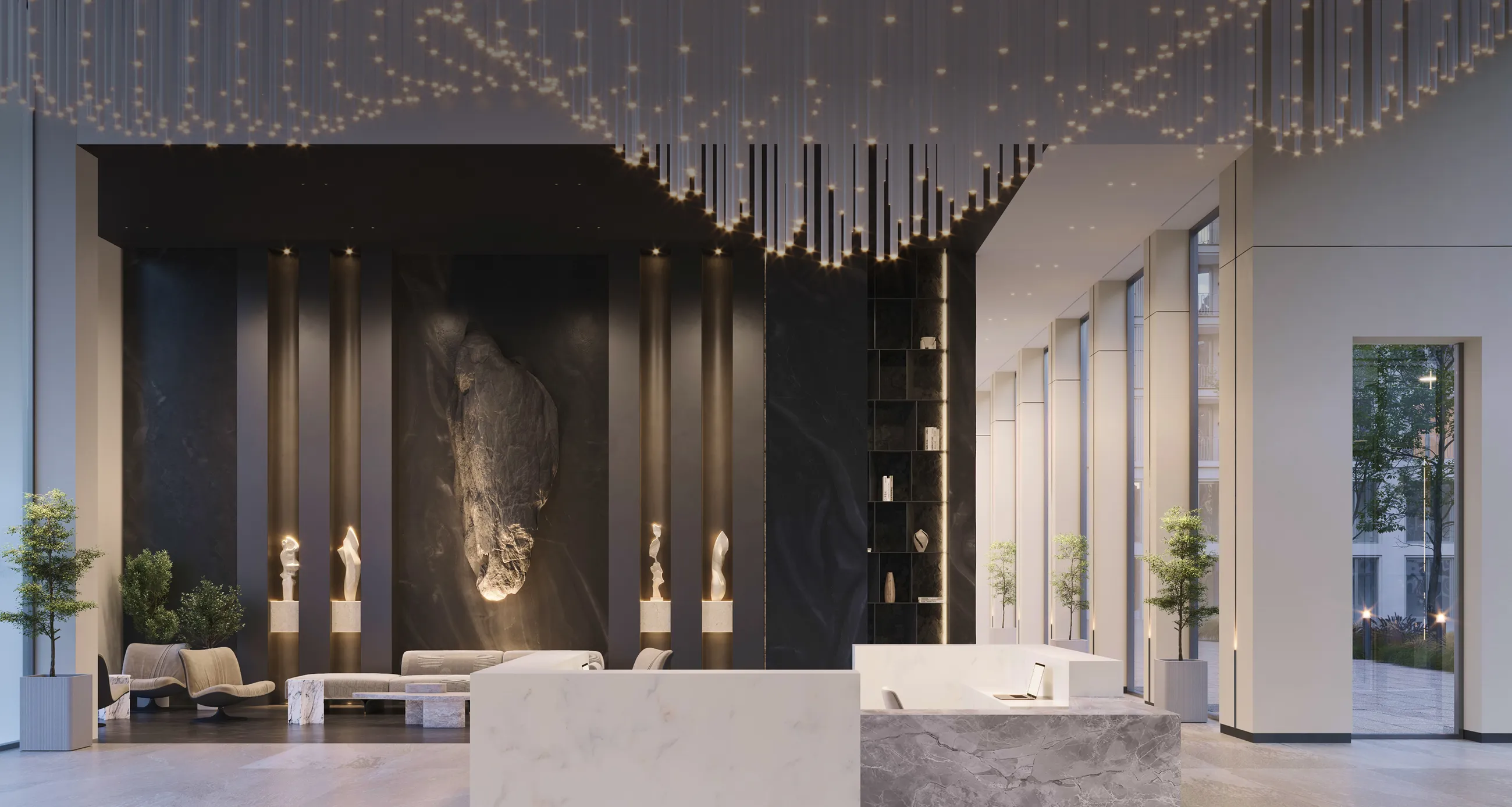 Дизайн парадных лобби впечатляет образами зарождения мира и первозданной красоты, воплощёнными в натуральных материалах и живых растениях.